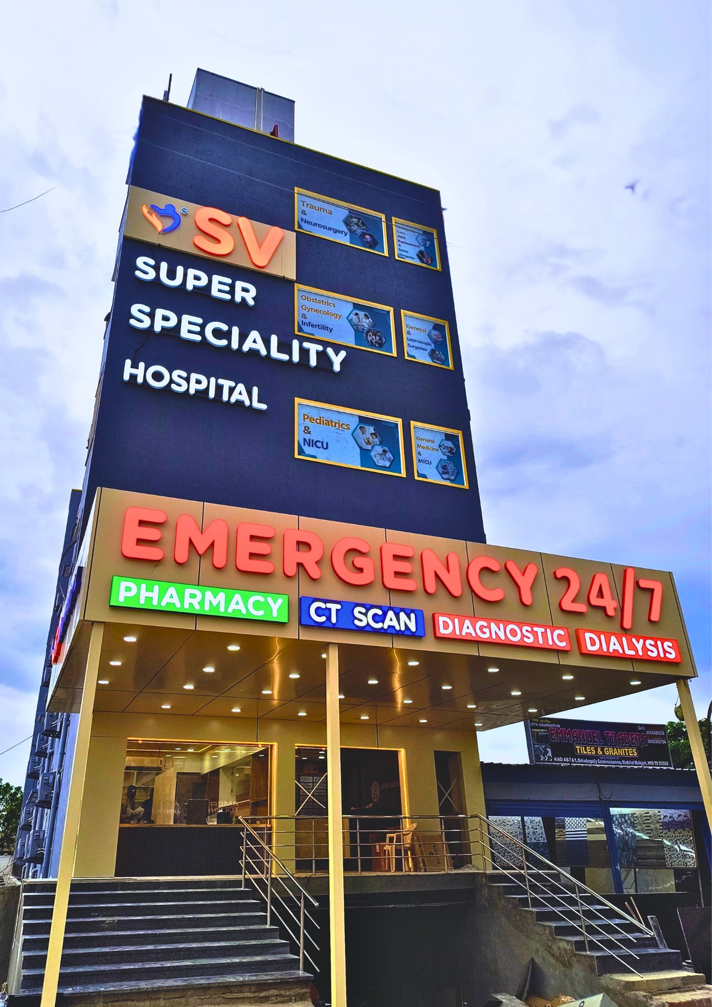 SV Super Specialty Hospital is a state-of-the-art, 50-bed, multiple disciplines facility located in North Hyderabad that specializes in offering comprehensive super-specialty medical care with cutting-edge equipment and amenities that meet or exceed worldwide standards. We provide a broad range of outpatient and inpatient services 24/7 in a friendly and inviting setting, fusing the best medical knowledge with individualized attention. The hospital offers the most cutting-edge super specialty medical care in a welcoming, easily accessible, and patient-focused setting.